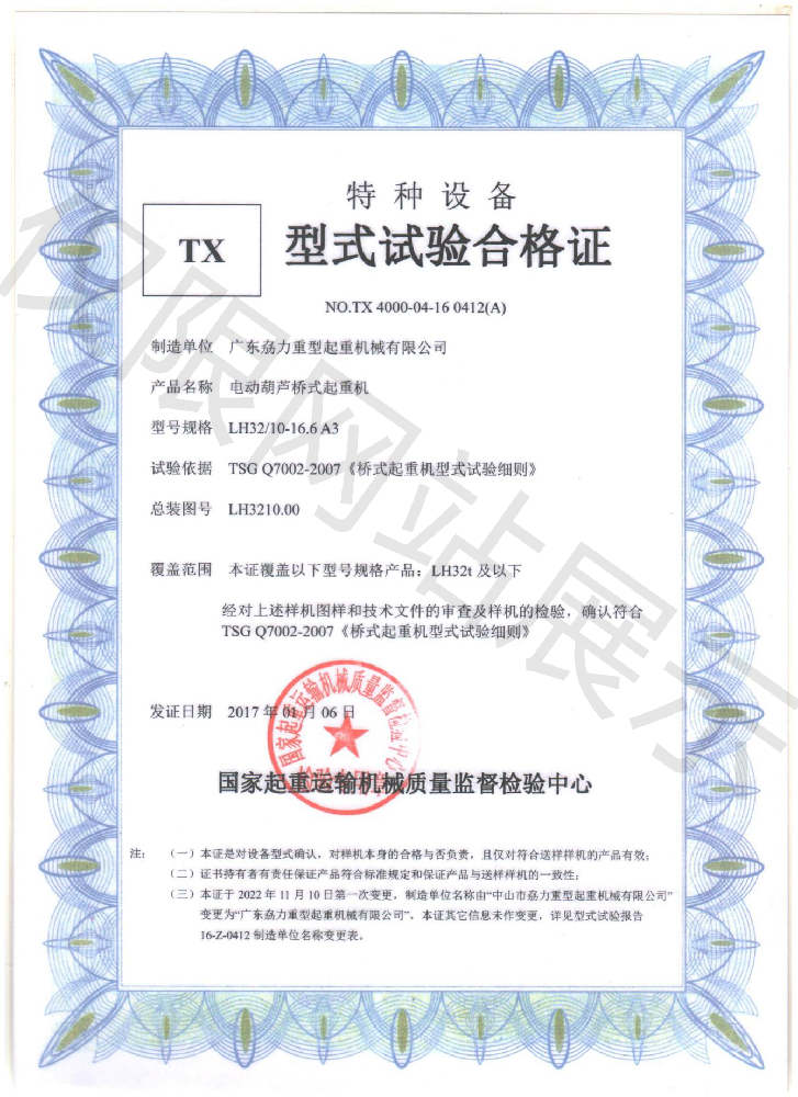 特種TX型式試驗(yàn)合格證--電動(dòng)葫蘆橋式起重機(jī)