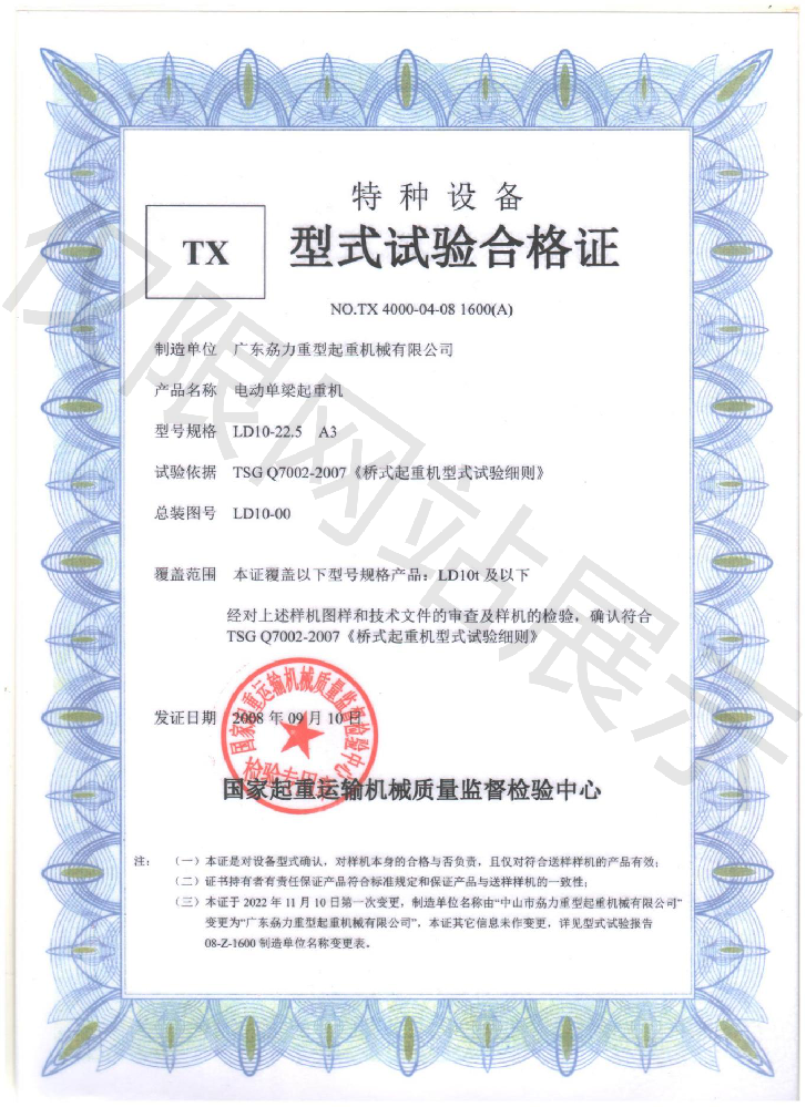 特種TX型式試驗(yàn)合格證--電動(dòng)單梁起重機(jī)