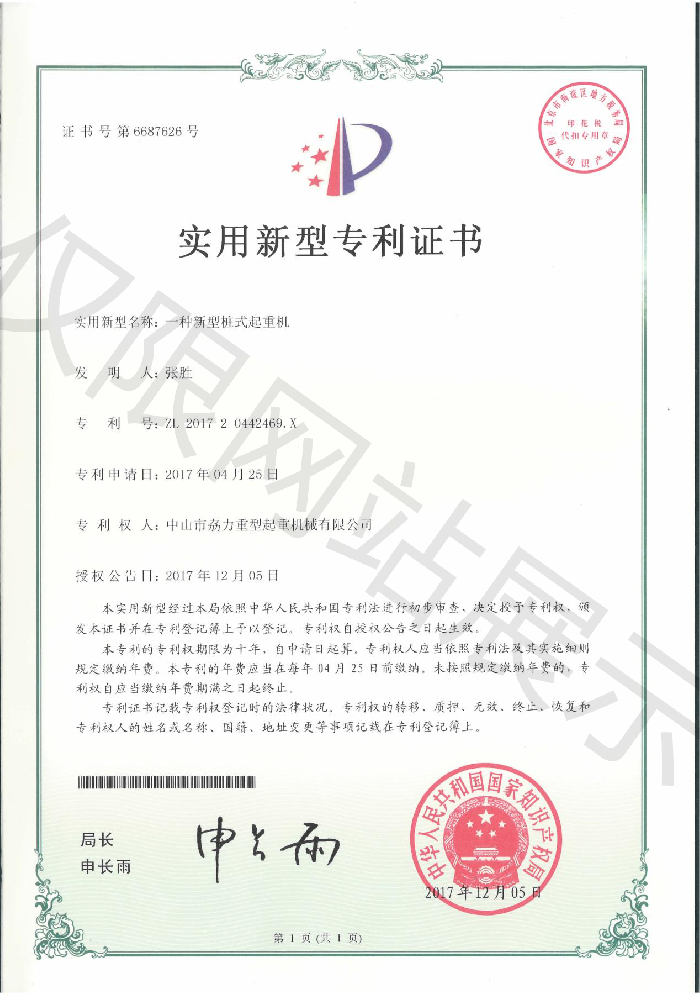 實(shí)用新型專利證書(shū) -- 新型樁式起重機(jī)