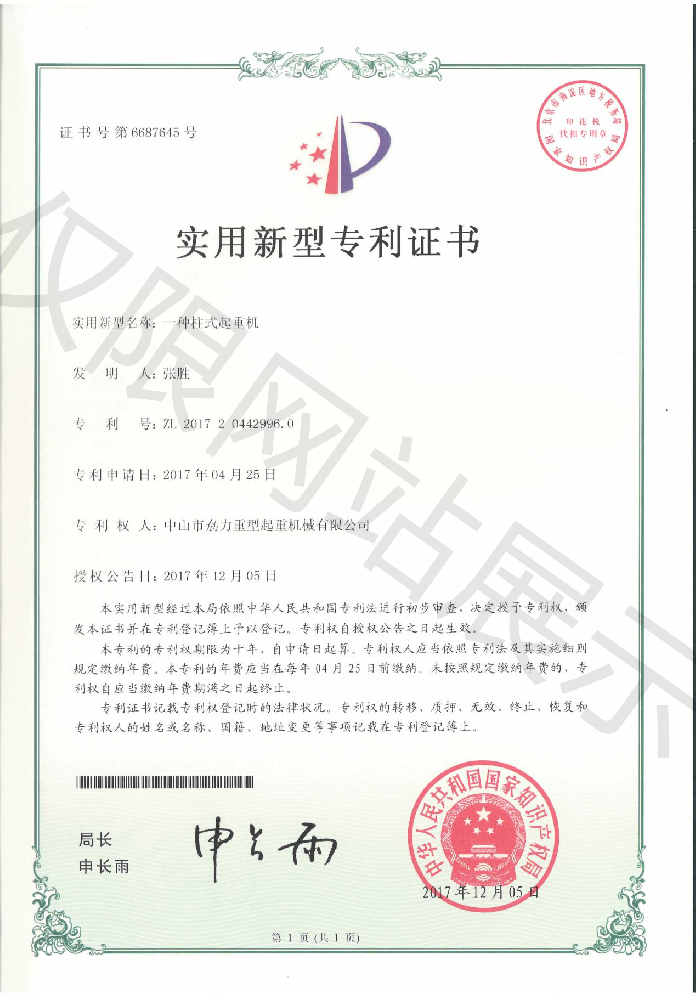 實(shí)用新型專利證書(shū) -- 柱式起重機(jī)
