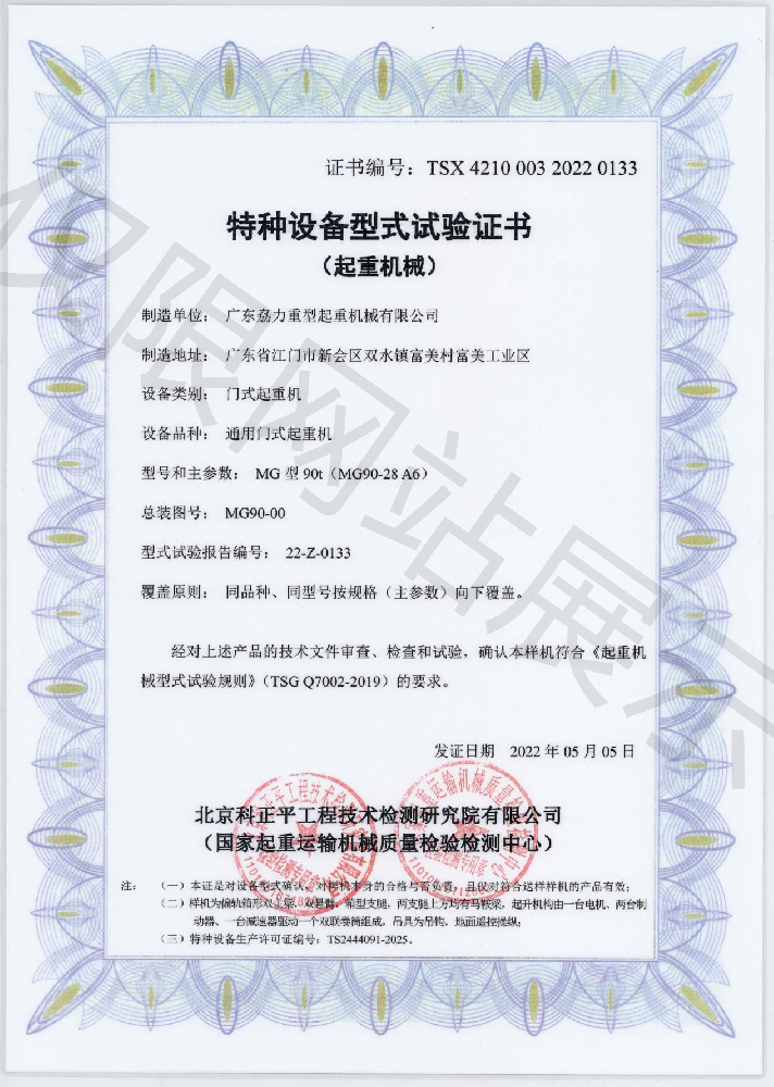 特種設(shè)備型式試驗(yàn)證書(shū)--通用門(mén)式起重機(jī)